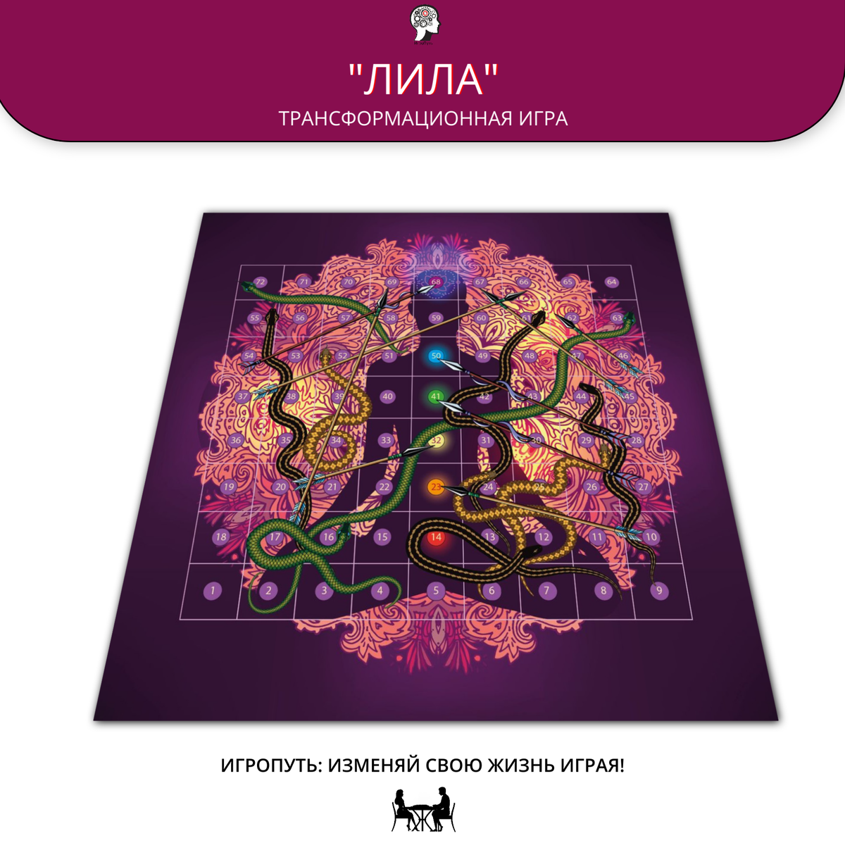 Игровое поле "Лилы" – это мандала, символическая карта внутреннего мира и пути духовного развития. Каждая из 72 клеток (в классической версии) имеет свое название и представляет определенное состояние сознания, качество или жизненную ситуацию.: