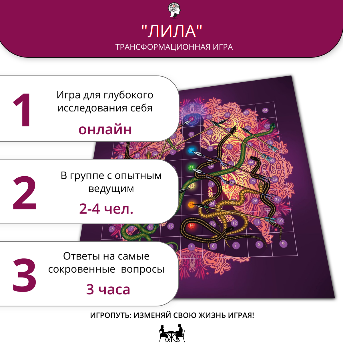 Загляните в глубины своего сознания и получите ответы на волнующие вас вопросы, чтобы открыть новые горизонты в своей жизни. Игра "Лила" вместе с ведущим станет вашим проводником на пути к трансформации.